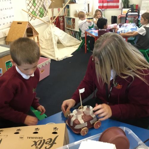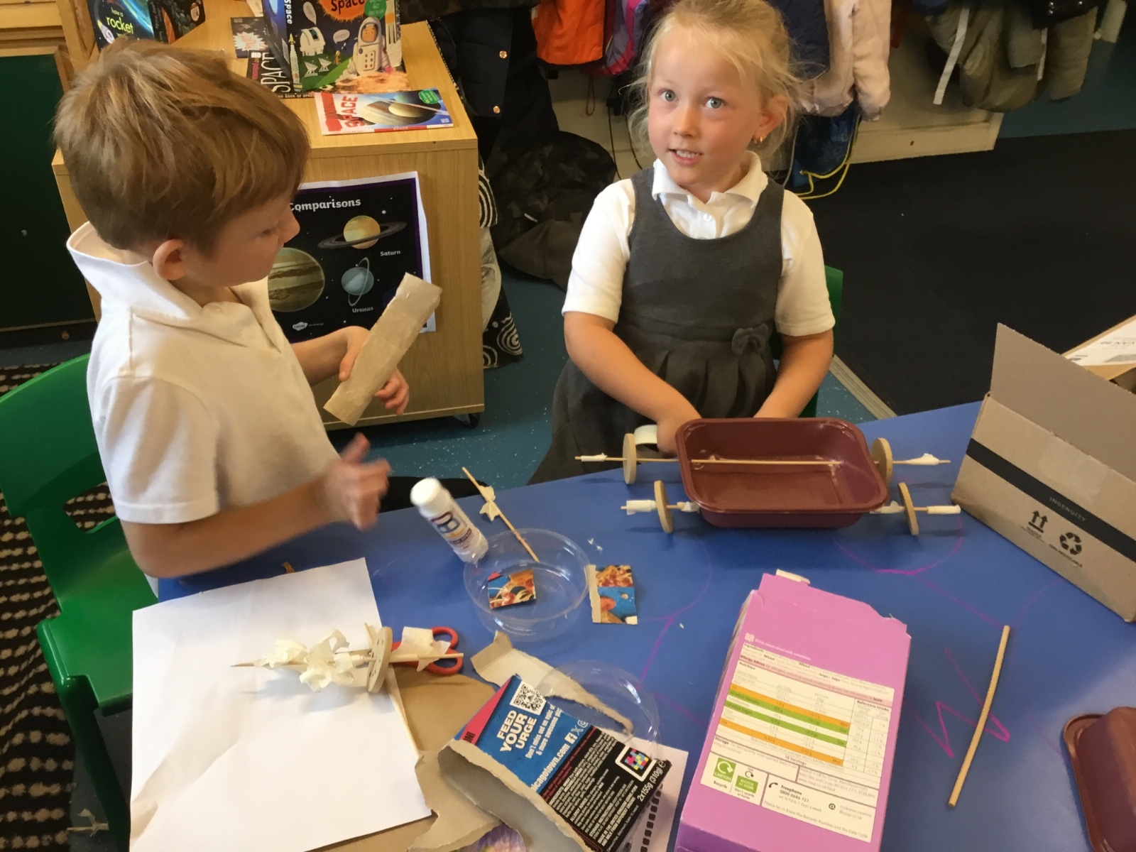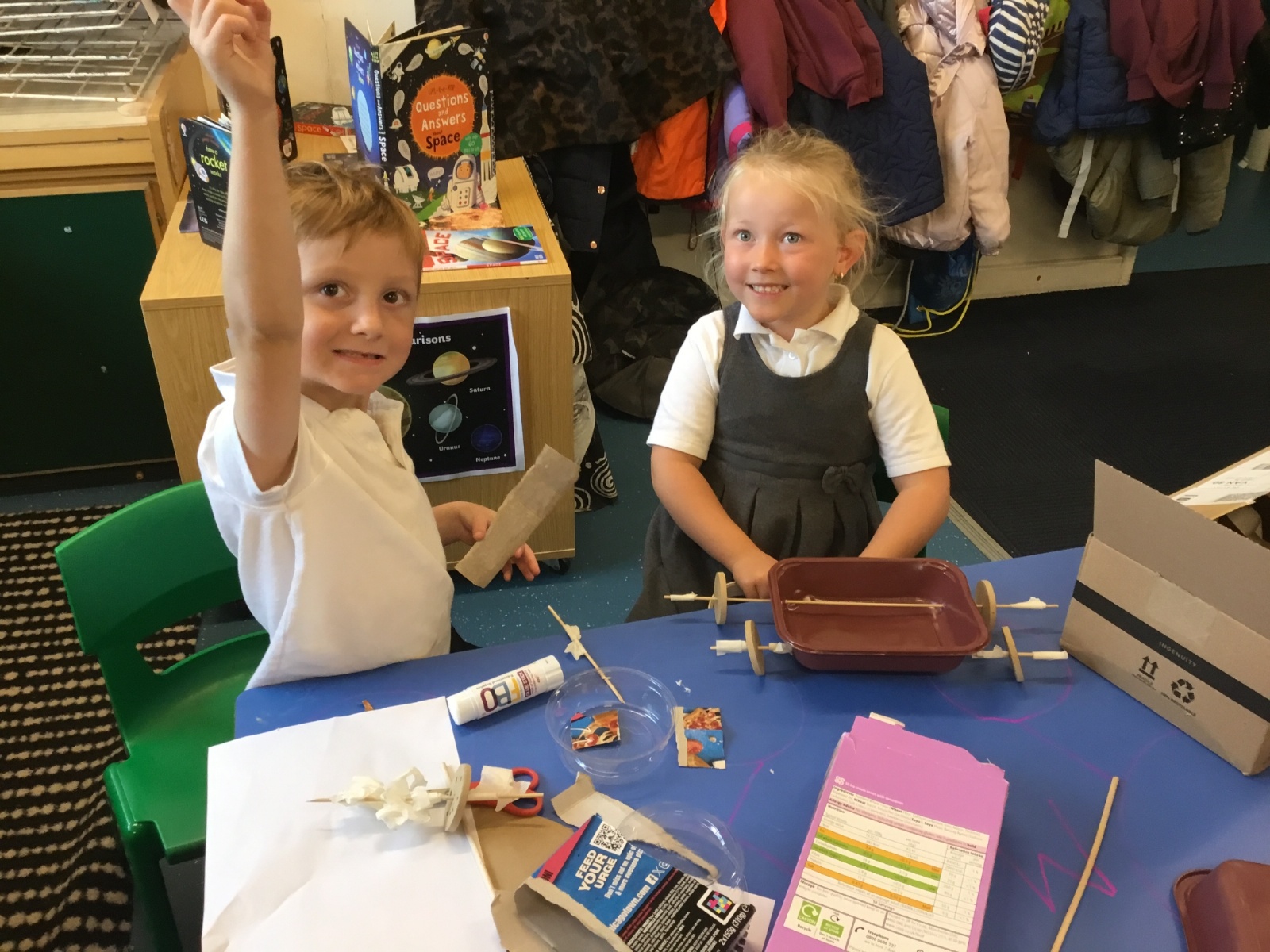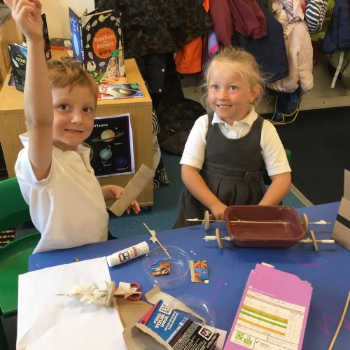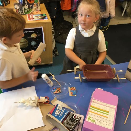 We have loved learning about space, making moon buggies, creating our own planets and compelting an investigation for a space suit. We have done lots of practical activites and some of our photos are below.